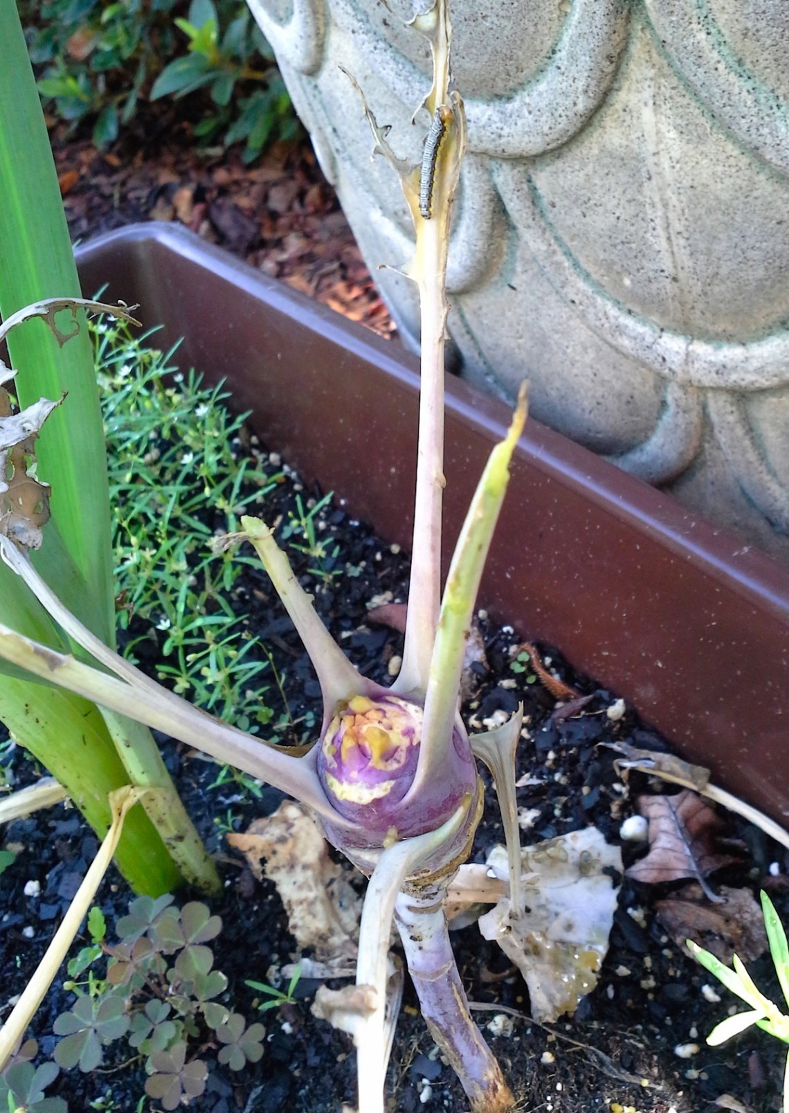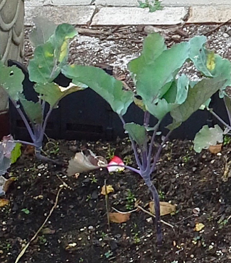 All seemed well at first. But as the weeks passed, these “fast growing” plants didn’t grow much. And then, just when the kohlrabi bulbs were finally starting to expand on their leggy stalk, I noticed big chucks of their leaves were missing.